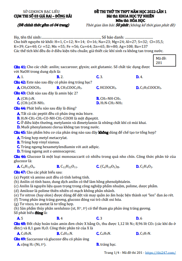 THI247.com giới thiệu đến bạn đọc đề minh họa kỳ thi tốt nghiệp THPT năm 2022 môn Hóa học do Bộ Giáo dục và Đào tạo công bố.