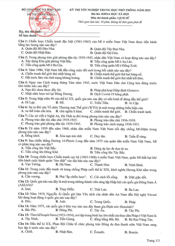 Trích dẫn đề minh họa Lịch sử kỳ thi THPT Quốc gia 2019 – Bộ Giáo dục và Đào tạo: