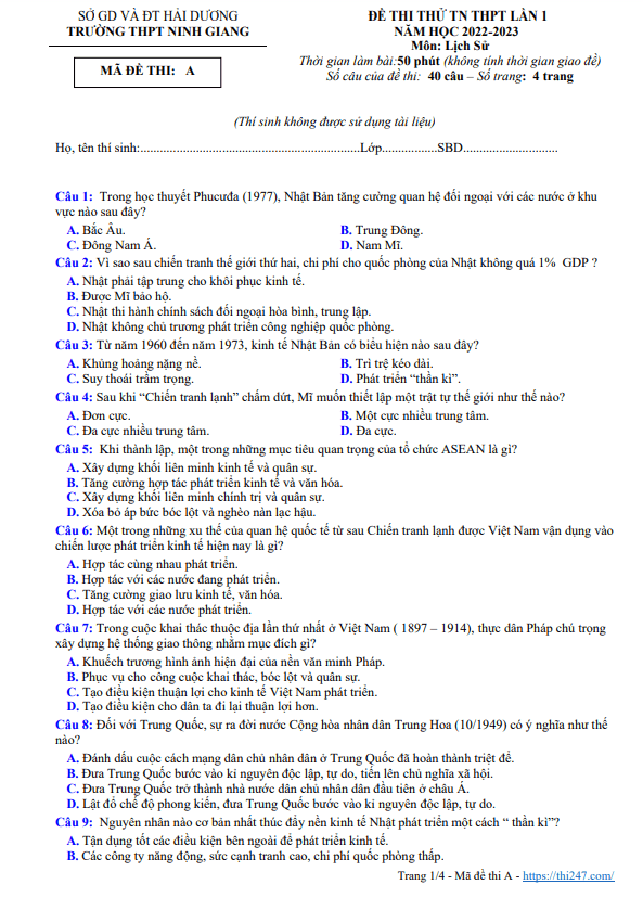 THI247.com sưu tầm và giới thiệu đến bạn đọc nội dung đề thi và bảng đáp án / hướng dẫn giải Đề rèn luyện Lịch sử 12 lần 2 năm 2022 – 2023 trường THPT Yên Thế – Bắc Giang.
