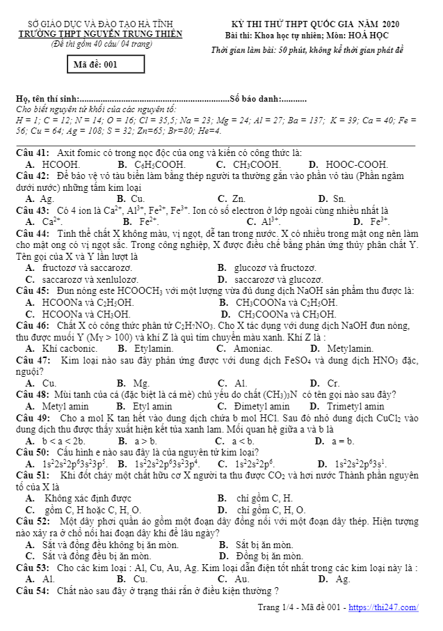 THI247.com chia sẻ đến bạn đọc đề tham khảo kỳ thi tốt nghiệp Trung học Phổ thông năm 2020 môn Hóa học, mời các bạn cùng tham khảo và thử sức.
