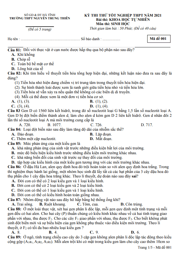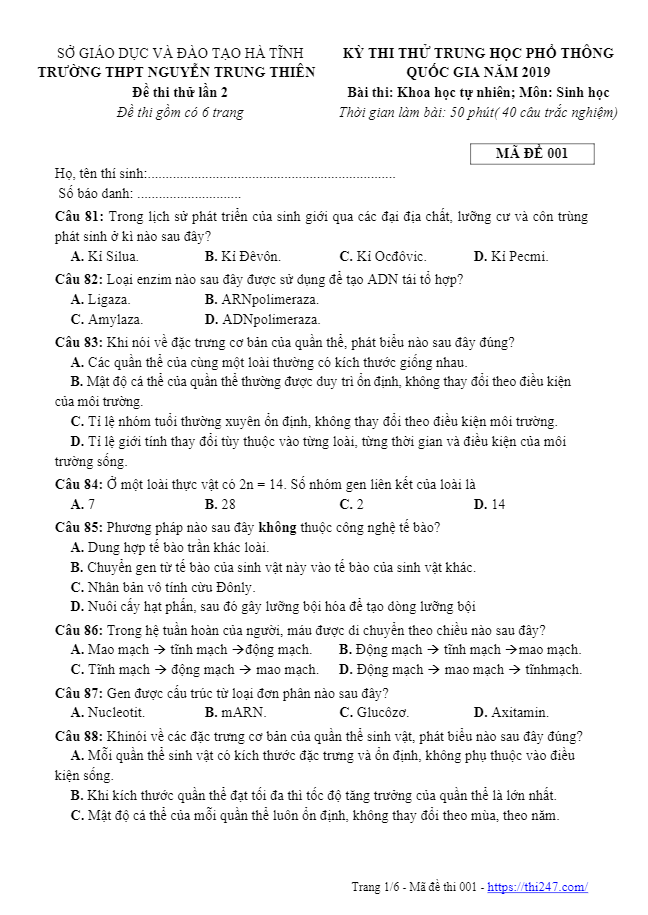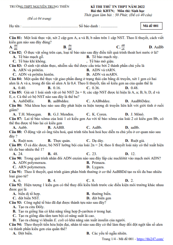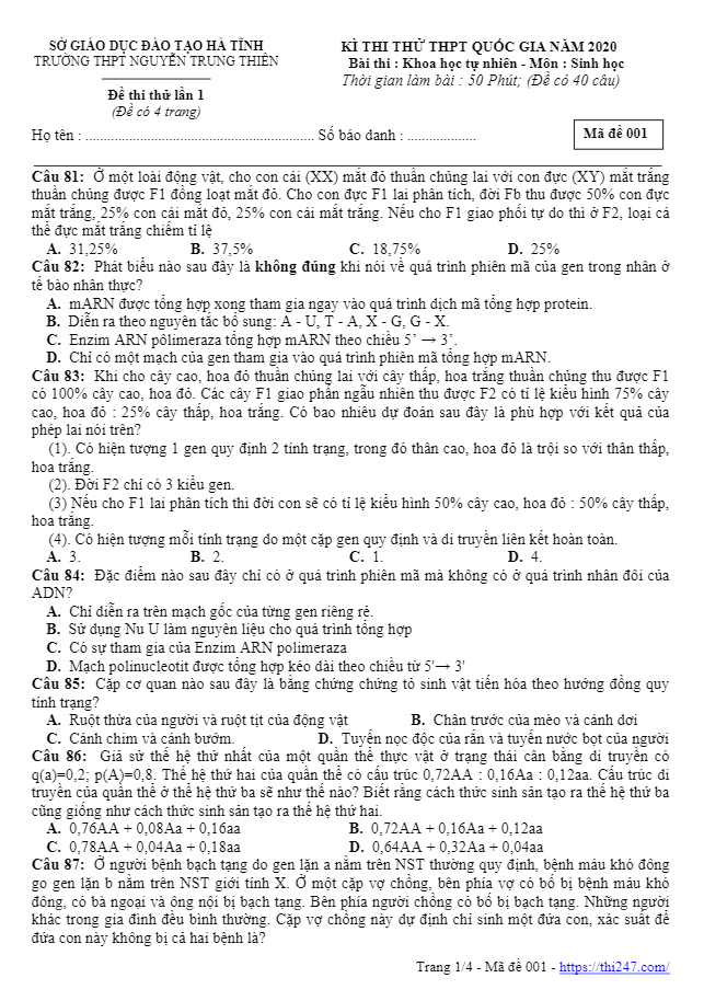 THI247.com chia sẻ đến bạn đọc đề tham khảo kỳ thi tốt nghiệp Trung học Phổ thông năm 2020 môn Sinh học, mời các bạn cùng tham khảo và thử sức.