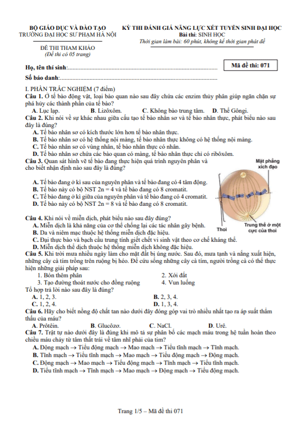 THI247.com sưu tầm và giới thiệu đến bạn đọc nội dung đề thi và bảng đáp án / hướng dẫn giải đề thi tham khảo kỳ thi đánh giá năng lực môn Sinh học xét tuyển Đại học hệ chính quy năm học 2022 – 2023 trường Đại học Sư Phạm Hà Nội.