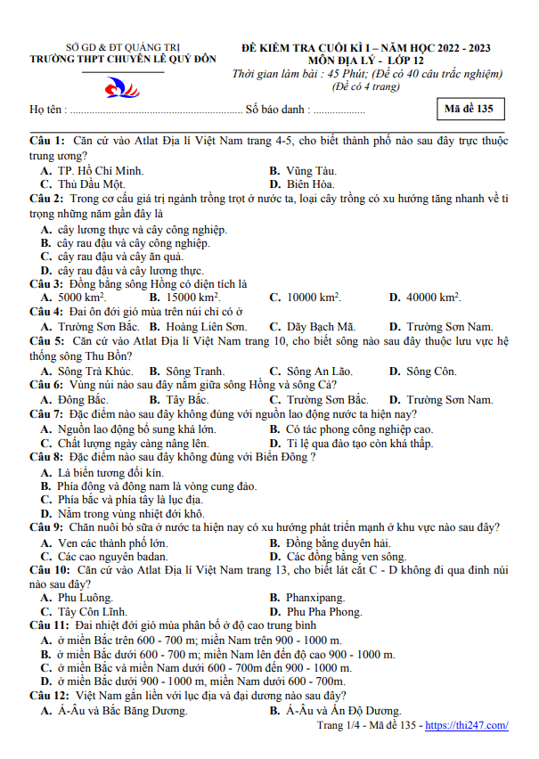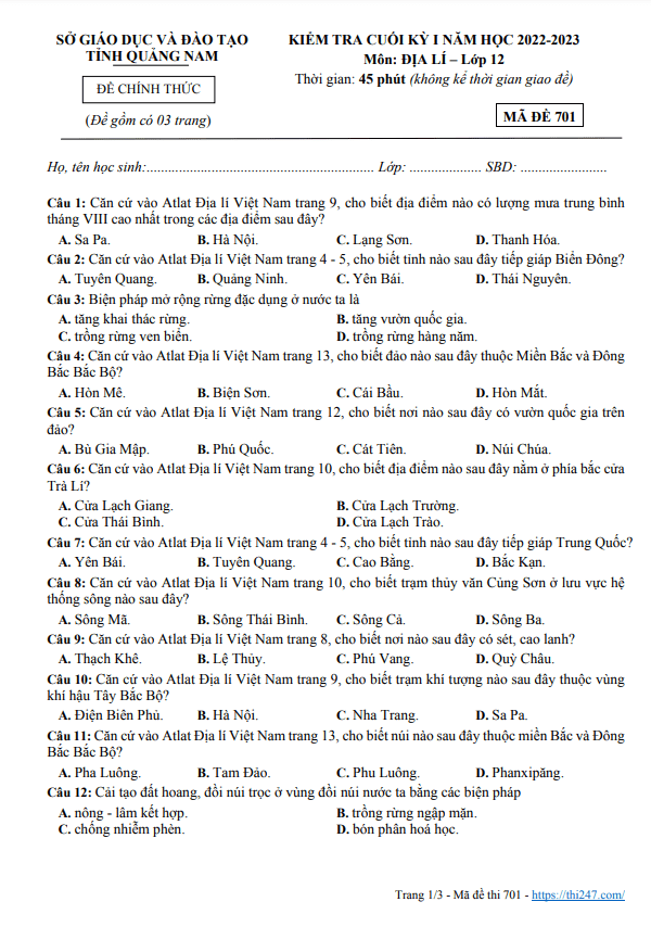 Đề thi cuối học kỳ 1 Địa lí 12 năm học 2021 – 2022 sở GD&ĐT Quảng Nam