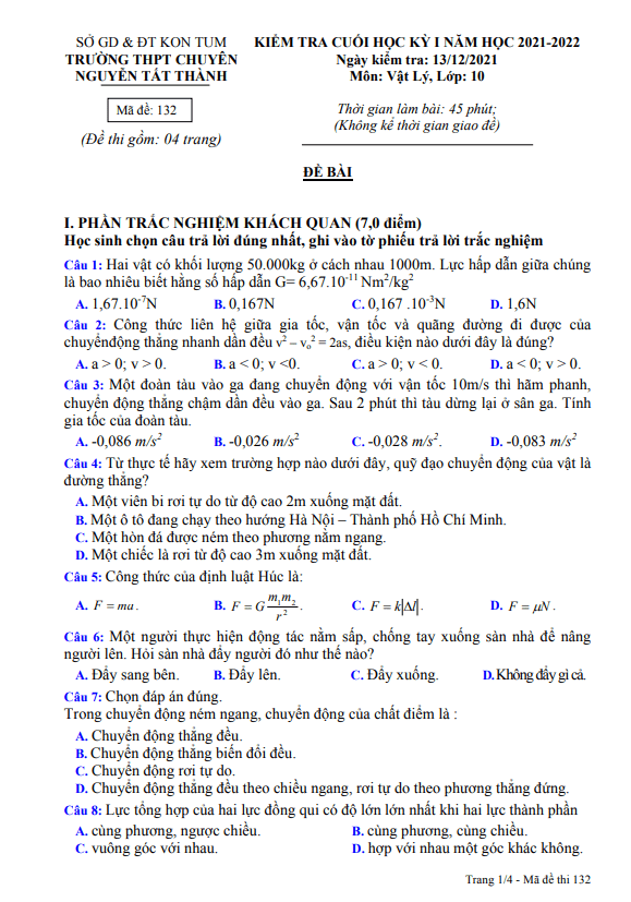 Đề thi cuối học kỳ 1 Vật lí 10 năm học 2021 – 2022 sở GD&ĐT Quảng Nam