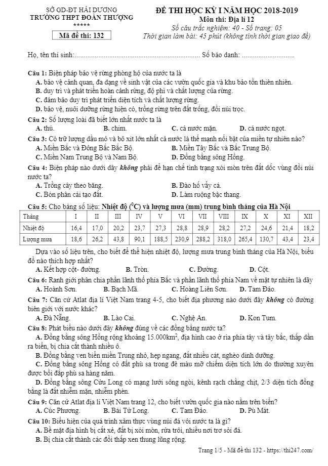 THI247.com giới thiệu đến bạn đọc nội dung đề thi và bảng đáp án / lời giải chi tiết đề thi cuối kì 1 Địa lí 12 năm 2021 – 2022 trường THPT Đoàn Thượng – Hải Dương.