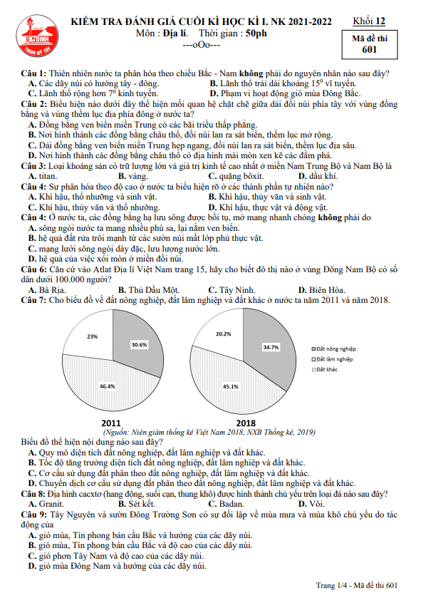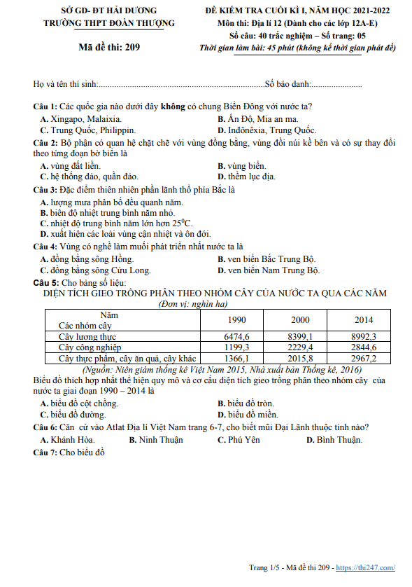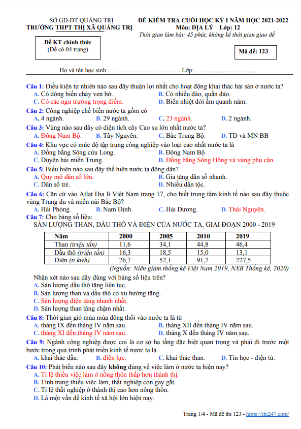 THI247.com chia sẻ đến bạn đọc nội dung đề thi + bảng đáp án đề thi cuối kì 1 Địa lý 12 năm 2021 – 2022 trường Lương Ngọc Quyến – Thái Nguyên; bạn đọc có thể tải xuống miễn phí file PDF (định dạng .pdf) hoặc file WORD (định dạng .doc / .docx) để phục vụ cho công tác học tập / giảng dạy.