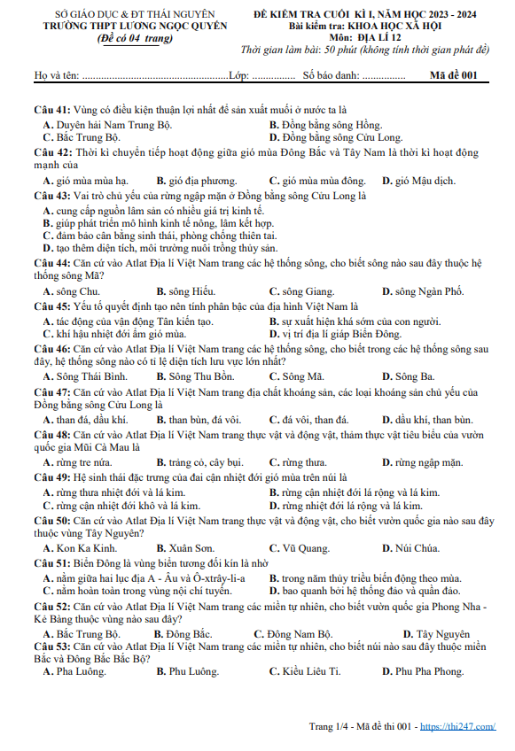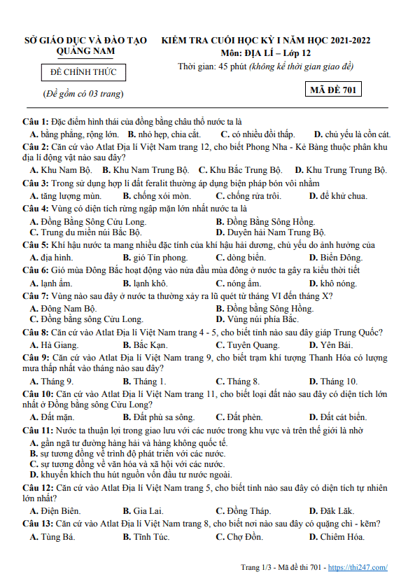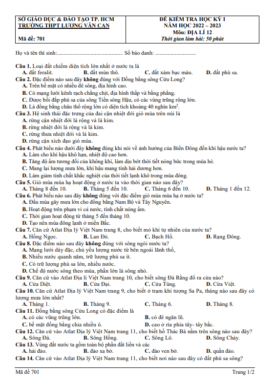 Câu 50: Loại gió nào sau đây gây mưa lớn cho Nam Bộ nước ta vào giữa và cuối mùa hạ? A. Gió mùa Tây Nam. B. Tín phong bán cầu Bắc. C. Tín phong bán cầu Nam. D. Gió mùa Đông Bắc. Câu 51: Điểm giống nhau chủ yếu của địa hình vùng đồi núi Đông Bắc và Tây Bắc là A. Đồi núi thấp chiếm ưu thế. B. Có nhiều khối núi cao đồ sộ. C. Nghiêng theo hướng Tây Bắc – Đông Nam. D. Có nhiều sơn nguyên, cao nguyên. Câu 52: Biểu hiện nào sau đây không phải là thiên nhiên vùng khí hậu cận xích đạo gió mùa A. có nhiệt độ trung bình năm trên 25°C, khí hậu phân hóa theo mùa, biên độ nhiệt nhỏ. B. cảnh quan thiên nhiên tiêu biểu là đới rừng nhiệt đới gió mùa, cảnh quan sắc thái thay đổi theo mùa. C. thành phần thực vật, động vật phần lớn thuộc vùng xích đạo và nhiệt đới. D. cảnh quan thiên nhiên tiêu biểu là đới rừng cận xích đạo gió mùa. Câu 53: Tính chất nhiệt đới của khí hậu nước ta biểu hiện ở A. độ ẩm lớn, cân bằng ẩm luôn dương. B. lượng mưa lớn, trung bình năm từ 1500mm đến 2000 mm. C. trong năm có hai mùa rõ rệt. D. tổng bức xạ lớn, cân bằng bức xạ dương quanh năm. Câu 54: Đất feralit ở nước ta thường bị chua vì A. có sự tích tụ nhiều Al2O3. B. quá trình phong hoá diễn ra với cường độ mạnh. C. có sự tích tụ nhiều Fe2O3. D. mưa nhiều trôi hết các chất badơ dễ tan. Câu 55: Căn cứ vào Atlat Địa lí Việt Nam trang 8, cho biết khí tự nhiên có ở mỏ nào sau đây? A. Tiền Hải. B. Hồng Ngọc. C. Rạng Đông. D. Bạch Hổ.