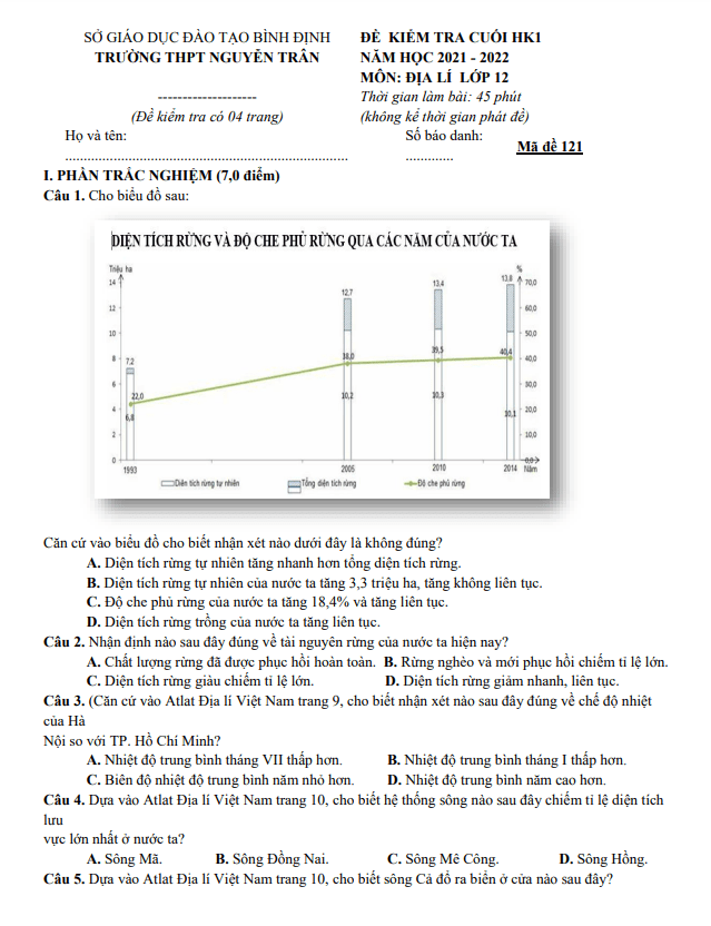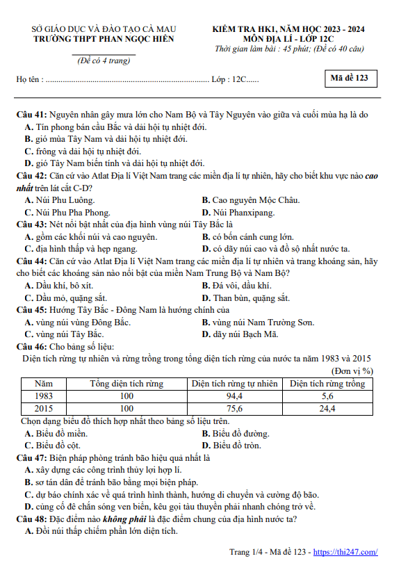Câu 41: Sự đối lập mùa mưa, mùa khô xảy ra giữa khu vực Duyên hải Nam Trung Bộ và Tây Nguyên chủ yếu do tác động của A. gió mùa Đông Bắc và bức chắn Trường Sơn Nam. B. của gió Tín phong bán cầu Bắc và hướng núi. C. các loại gió và bức chắn Trường Sơn Nam. D. của gió mùa hạ và bức chắn Trường Sơn Nam. Câu 42: “Xói mòn rửa trôi đất ở vùng núi, lụt trên diện rộng ở đồng bằng và hạ lưu các sông lớn trong mùa mưa, thiếu nước nghiêm trọng trong mùa khô” là những trở ngại lớn trong việc sử dụng thiên nhiên của miền? A. Bắc và Đông Bắc. B. Tây Bắc và Bắc Trung Bộ. C. Bắc Trung Bộ. D. Nam Trung Bộ và Nam Bộ. Câu 43: Miền Nam Trung Bộ và Nam Bộ có đặc điểm khí hậu nào dưới đây? A. Trong năm chia thành mùa hạ nóng, mùa đông lạnh. B. Khí hậu cận xích đạo gió mùa, biên độ nhiệt trong năm nhỏ. C. Gió mùa Đông Bắc hoạt động mạnh nhất, tạo nên một mùa đông lạnh. D. Vào mùa hạ, nhiều nơi có gió Tây khô nóng hoạt động. Câu 44: Biện pháp nào sau đây không phải là một biện pháp bảo vệ tài nguyên rừng nước ta? A. Có kế hoạch, biện pháp bảo vệ nuôi dưỡng rừng hiện có. B. Bảo vệ cảnh quan đa dạng sinh học ở các vườn quốc gia. C. Đảm bảo duy trì phát triển diện tích và chất lượng rừng. D. Quy định việc khai thác.