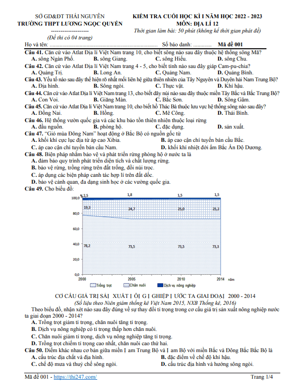 Câu 45: Căn cứ vào Atlat Địa lí Việt Nam trang 6 – 7, cho biết dãy núi nào sau đây có hướng tây – đông? A. Hoàng Liên Sơn. B. Con Voi. C. Ngân Sơn. D. Bạch Mã. Câu 46: Đồng bằng sông Cửu Long khác với Đồng bằng sông Hồng ở A. Diện tích nhỏ hơn. B. Phù sa không bồi đắp hàng năm C. Thấp và khá bằng phẳng D. Cao ở rìa đông, thấp ở giữa Câu 47: Cho biểu đồ: Biểu đồ trên thể hiện nội dung nào sau đây? A. Cơ cấu một số mặt hàng xuất khâu của nước ta giai đoạn 2000 – 2015. B. Quy mô một số mặt hàng xuất khẩu của nước ta giai đoạn 2000 – 2015. C. Tốc độ tăng trưởng một số mặt hàng xuất khẩu của nước ta giai đoạn 2000 – 2015. D. Sự chuyển dịch cơ cấu một số mặt hàng xuất khẩu của nước ta giai đoạn 2000 – 2015. Câu 48: Dựa vào Atlat Địa lí Việt Nam trang 9, cho biết điểm giống nhau giữa trạm khí tượng TP. Hồ Chí Minh và Cà Mau là A. biên độ nhiệt năm lớn. B. nhiệt độ trung bình năm cao trên 250 C. C. mùa khô từ tháng V-X. D. mùa mưa từ tháng XI – IV năm sau. Câu 49: Đặc điểm nào sau đây đúng về thiên nhiên đai cận nhiệt đới gió mùa trên núi? A. Đất trong đai gồm: Đất phù sa chiếm gần 24% diện tích tự nhiên cả của nước; đất feralit chiếm 60% diện tích tự nhiên của cả nước. B. Sinh vât gồm: hệ sinh thái rừng nhiệt đới ẩm lá rộng thường xanh hình thành những vùng núi thấp mưa nhiều; Hệ sinh thái rừng nhiệt đới gió mùa. C. Khí hậu mát mẻ, không có tháng nào nhiệt độ trên 25°C, mưa nhiều hơn, độ ẩm tăng. D. Khí hậu nhiệt đới biểu hiện rõ rệt, mùa hạ nóng (nhiệt độ trung bình tháng trên 25°C). Độ ẩm thay đổi tùy nơi: từ khô đến ẩm ướt.