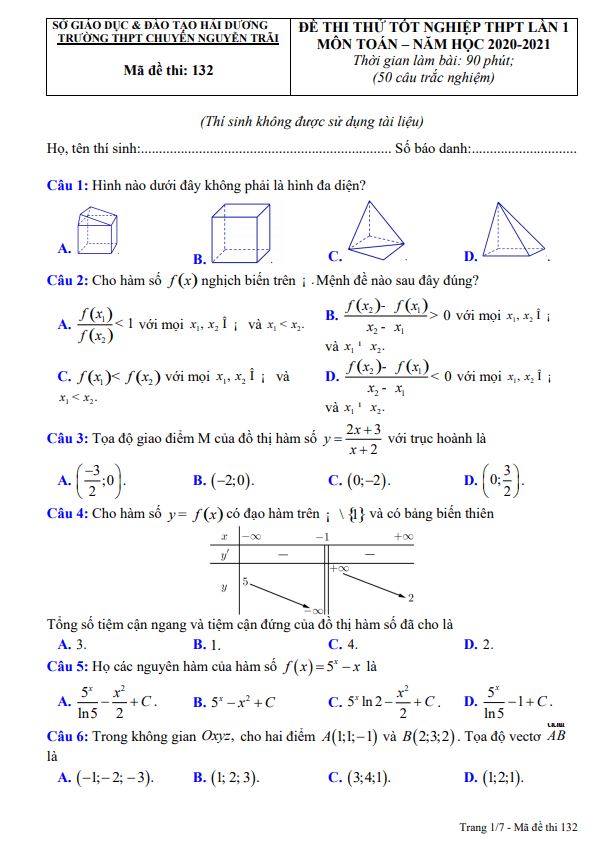 Đề thi thử Toán TN THPT 2021 lần 1 trường chuyên Nguyễn Trãi – Hải Dương