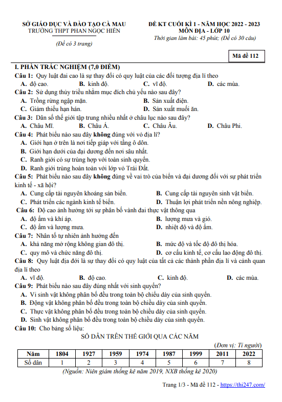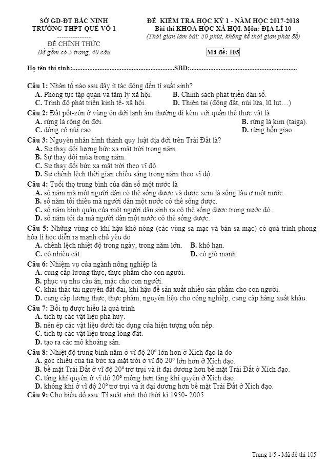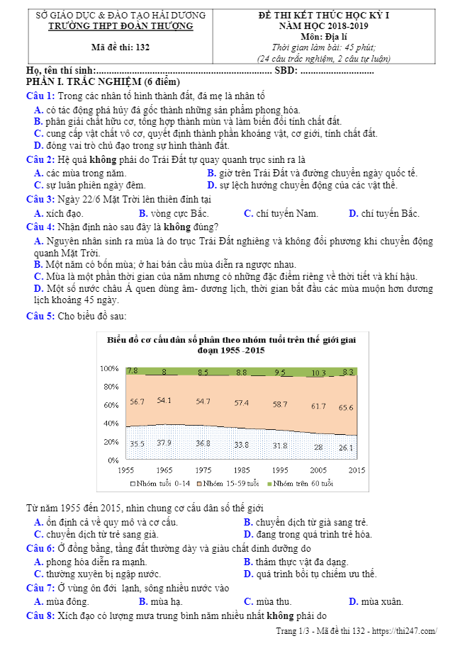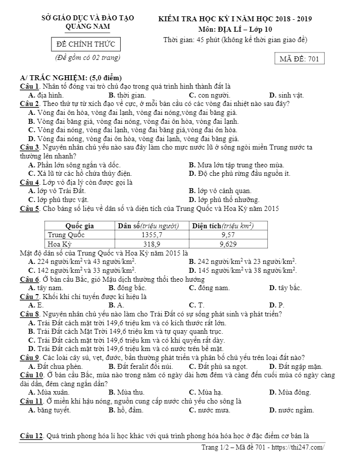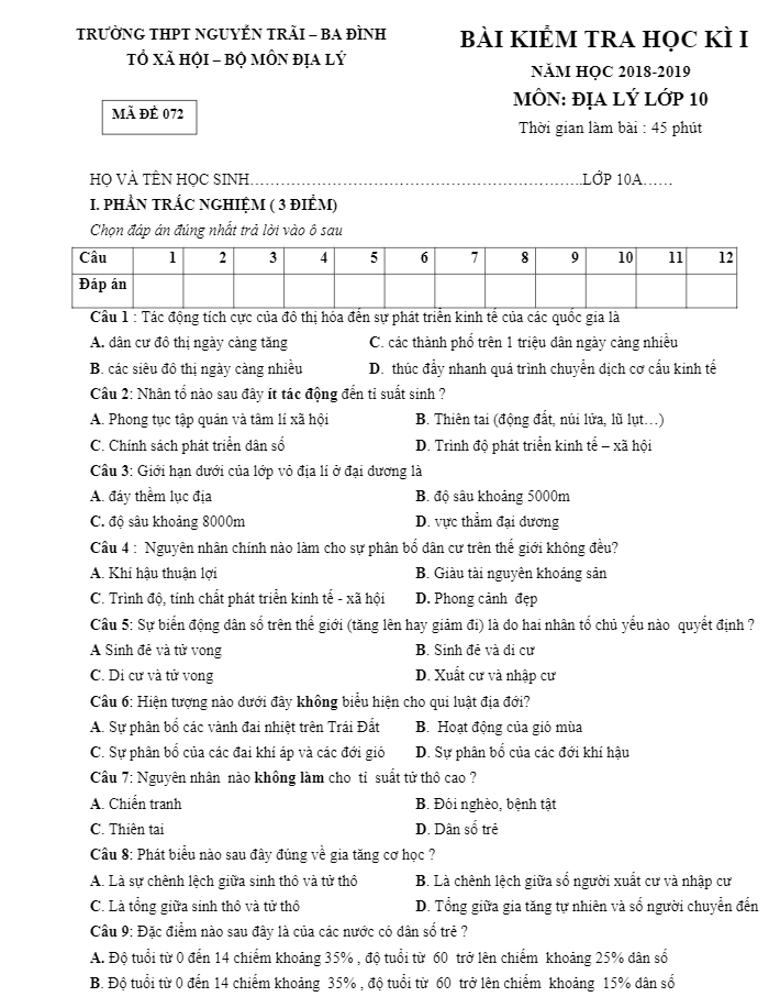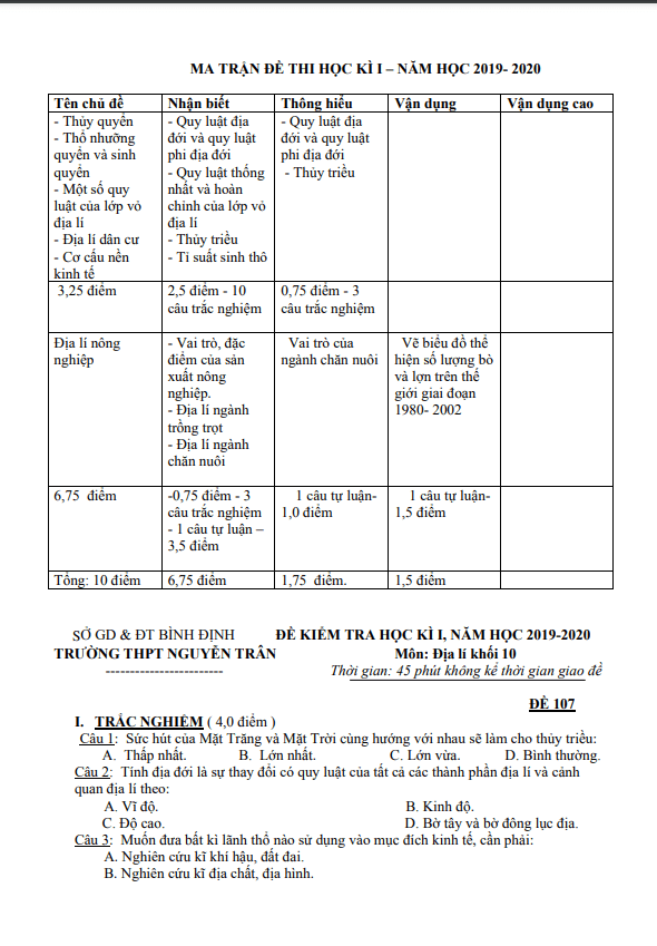 Trích dẫn đề thi HK1 Địa lý 10 năm 2018 – 2019 trường Lương Ngọc Quyến – Thái Nguyên: