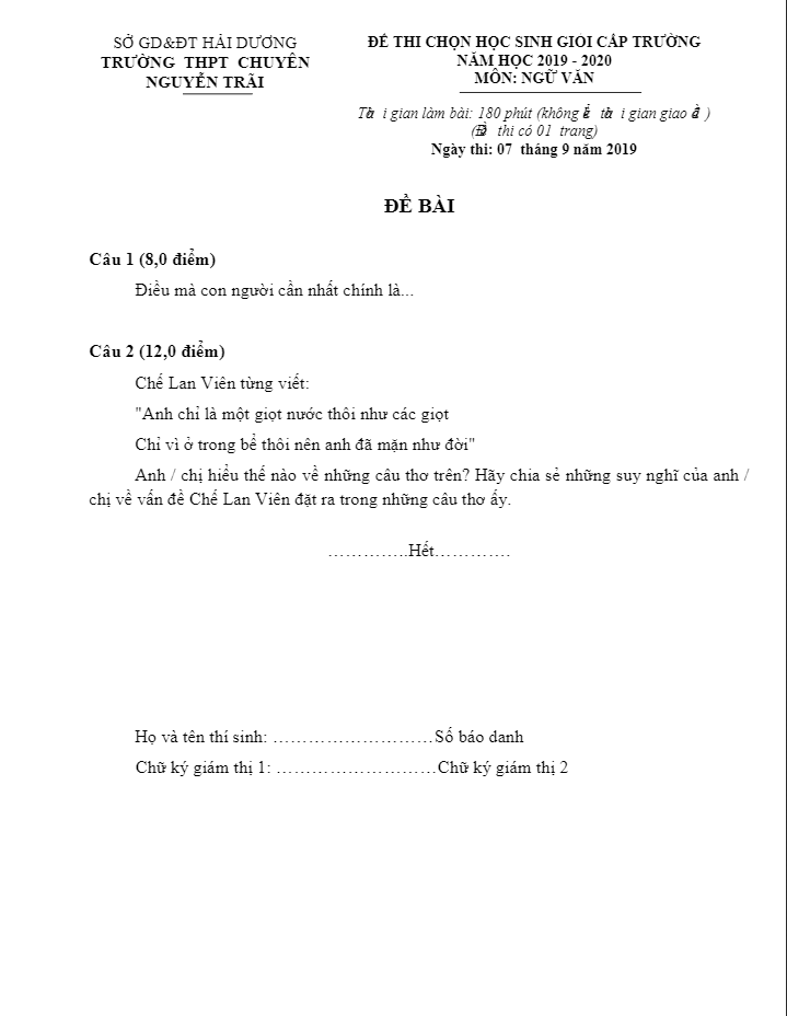 Đề thi học sinh giỏi Ngữ Văn 12 năm 2021 – 2022 trường chuyên Nguyễn Trãi – Hải Dương