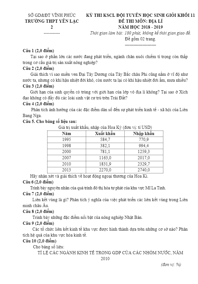 Câu 1. Phát biểu nào sau đây không đúng với các nước đang phát triển? A. GDP bình quân đầu người thấp. B. Đầu tư nước ngoài (FDI) nhỏ. C. Các khoản nợ nước ngoài rất nhỏ. D. Chỉ số phát triển con người thấp. Câu 2. Khu vực Mỹ Latinh có kinh tế còn chậm phát triển chủ yếu do A. quản lí yếu, gắn kết trong khu vực yếu, nạn tham nhũng. B. bạo lực và tệ nạn ma tuý, dân trí chưa cao, tham nhũng. C. chính trị thiếu ổn định, quản lí yếu, tham nhũng nhiều. D. lạm phát, nạn tham nhũng, tỉ lệ thất nghiệp còn khá lớn.