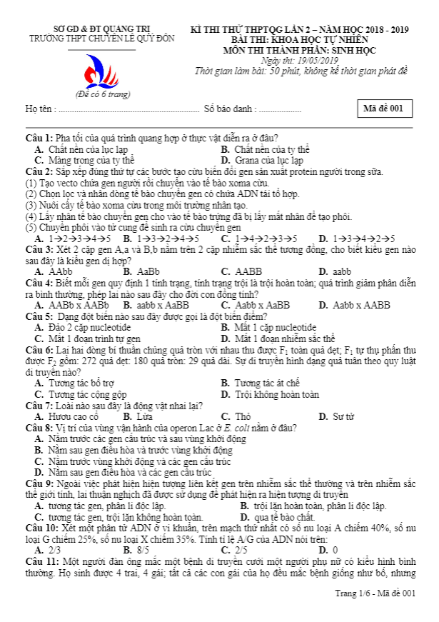 Đồng hành cùng các bạn chinh phục kỳ thi tốt nghiệp THPT 2020 môn Sinh học, tuyển sinh vào các trường Đại học – Cao đẳng, THI247.com giới thiệu đến các bạn nội dung đề thi kèm bảng đáp án đề thi thử Đại học năm 2020 môn Sinh học lần 1 trường THPT chuyên Nguyễn Quang Diêu – Đồng Tháp.
