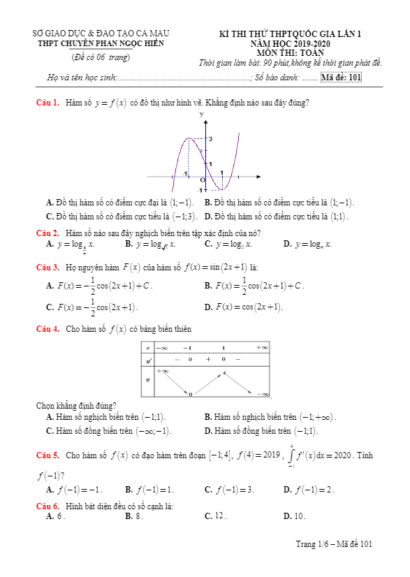 Trích dẫn đề thi thử Đại học năm 2020 môn Toán lần 1 trường chuyên Nguyễn Quang Diêu – Đồng Tháp: