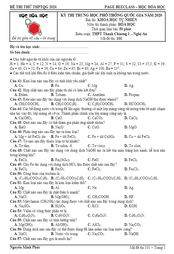 THI247.com giới thiệu đến bạn đọc một đề thi thử Hóa học 2019 có đáp án chất lượng, đó là đề thi thử Hóa học THPT Quốc gia 2019 lần 1 trường Thanh Chương 1 – Nghệ An, đề có mã 132 gồm 04 trang với 40 câu trắc nghiệm, thời gian làm bài 50 phút, đề được biên soạn bám sát đề minh họa Hóa học 2019 do Bộ Giáo dục và Đào tạo công bố, đề thi có đáp án.