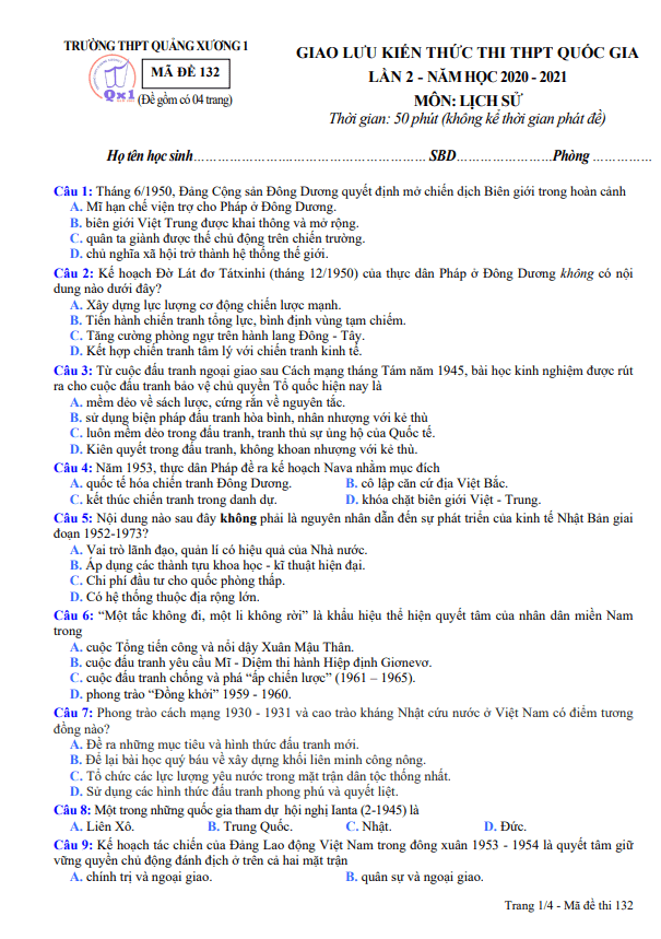 Câu 3. “Theo đuổi chính sách hòa bình, trung lập, tích cực, luôn luôn ủng hộ cuộc đấu tranh giành độc lập của các dân tộc” là đường lối đối ngoại của quốc gia nào? A. Ấn Độ. B. Campuchia. C. Mĩ. D. Liên Xô. Câu 4. Nhận xét nào đúng về vai trò của đấu tranh ngoại giao trong kháng chiến chống Pháp (1945-1954) ở Việt Nam? A. Phát huy yếu tố chính nghĩa của Việt Nam trong kháng chiến. B. Phát huy lợi thế trên bản hội nghị để tiến công quân sự trên chiến trường. C. Đi trước thắng lợi về quân sự để giảm bớt tổn thất trên chiến trường. D. Phụ thuộc vào chính sách đối ngoại của các thế lực ngoại xâm.