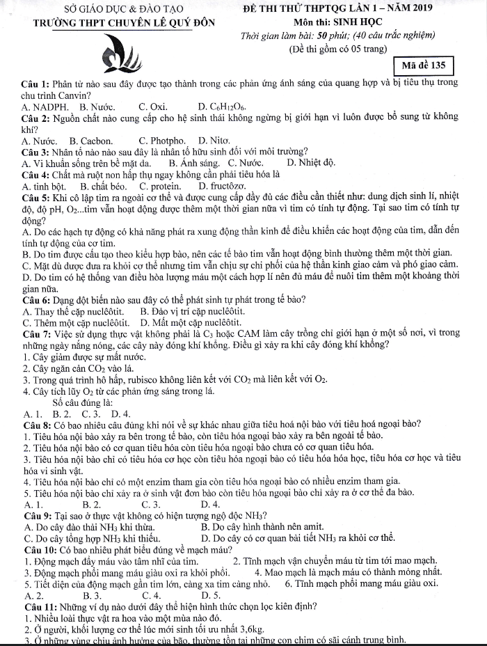 Trích dẫn đề thi thử Sinh học THPTQG 2019 lần 1 trường chuyên Nguyễn Trãi – Hải Dương: