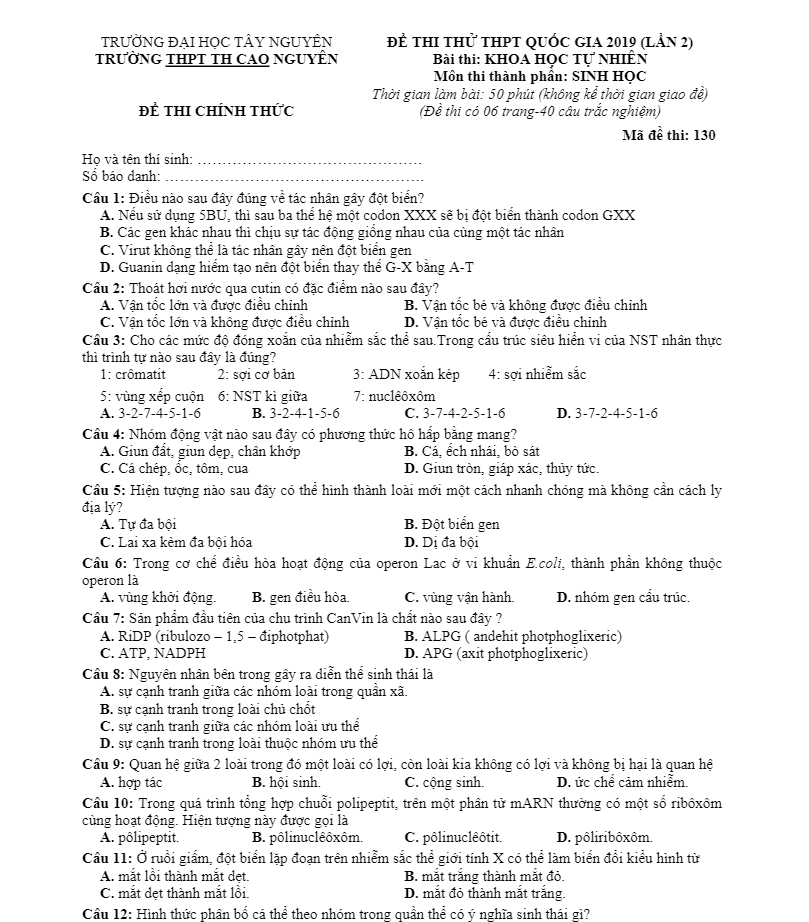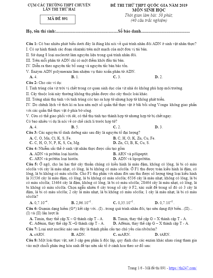 Đề thi thử Sinh học THPTQG 2019 lần 1 trường chuyên Nguyễn Trãi – Hải Dương có mã đề 502 gồm 6 trang với 40 câu trắc nghiệm khách quan môn Sinh học 10 – 11 – 12, thời gian làm bài thi thử Sinh học là 50 phút, theo đánh giá của THI247.com, đề có cấu trúc giống và độ khó tương đương với đề tham khảo THPT Quốc gia môn Sinh học năm 2019 do Bộ Giáo dục và Đào tạo đề xuất, đề thi có đáp án đầy đủ các mã đề.