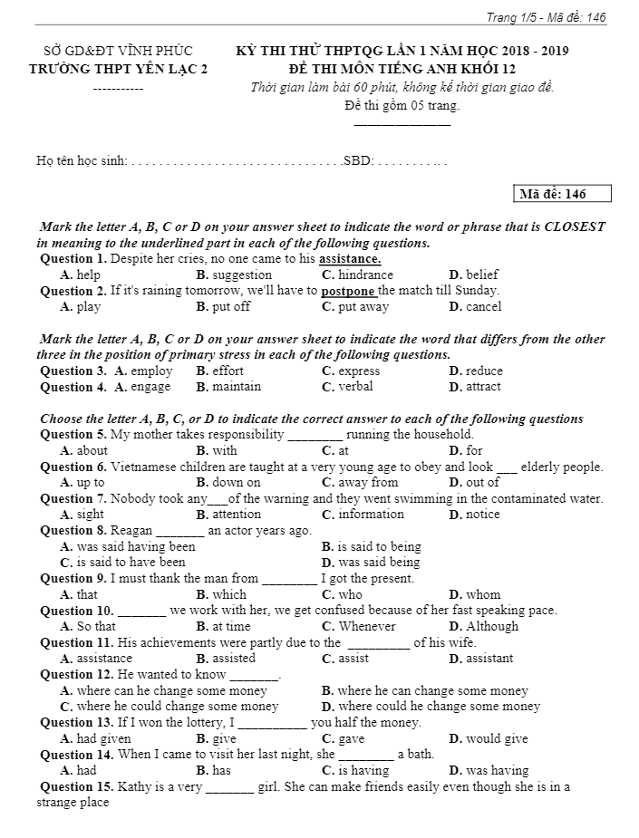 Chỉ còn khoảng 03 tháng nữa là kỳ thi Trung học Phổ thông Quốc gia 2019 môn Tiếng Anh do Bộ Giáo dục và Đào tạo tổ chức sẽ diễn ra, do đó yêu cầu được rèn luyện kiến thức môn Tiếng Anh THPT một cách thường xuyên là hết sức cần thiết, và vừa qua, trường THPT Yên Lạc số 2, tỉnh Vĩnh Phúc đã tổ chức kỳ thi thử THPT Quốc gia môn Tiếng Anh năm học 2018 – 2019 lần thứ ba, kỳ thi diễn ra vào giai đoạn giữa học kỳ 2 năm học 2018 – 2019.