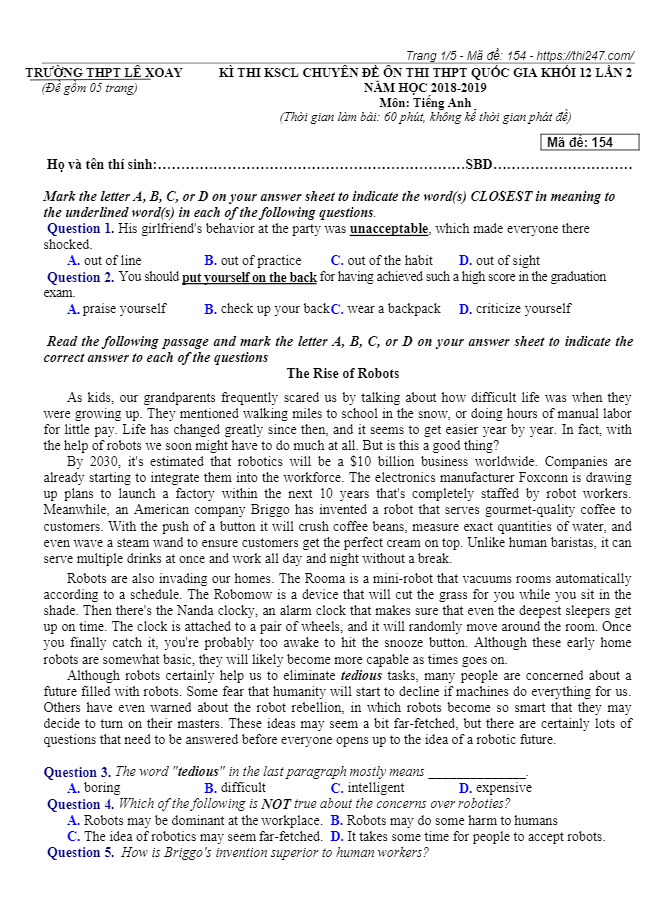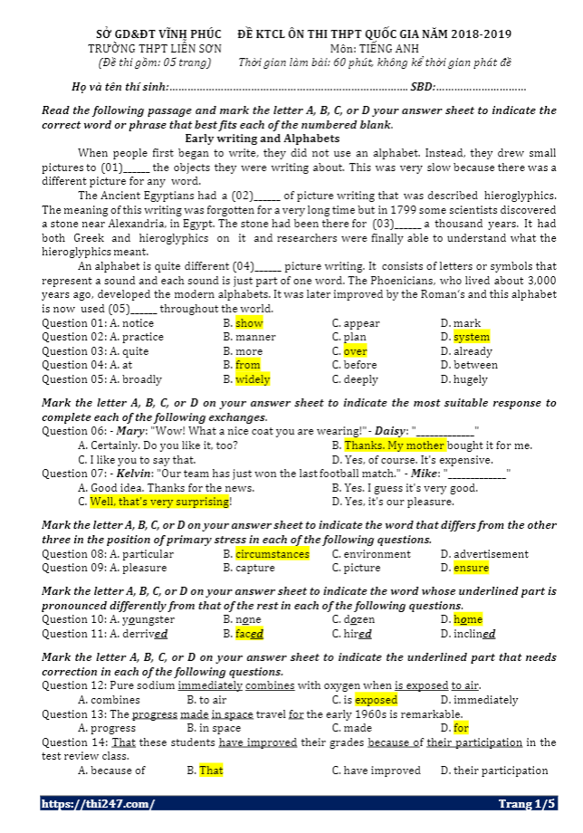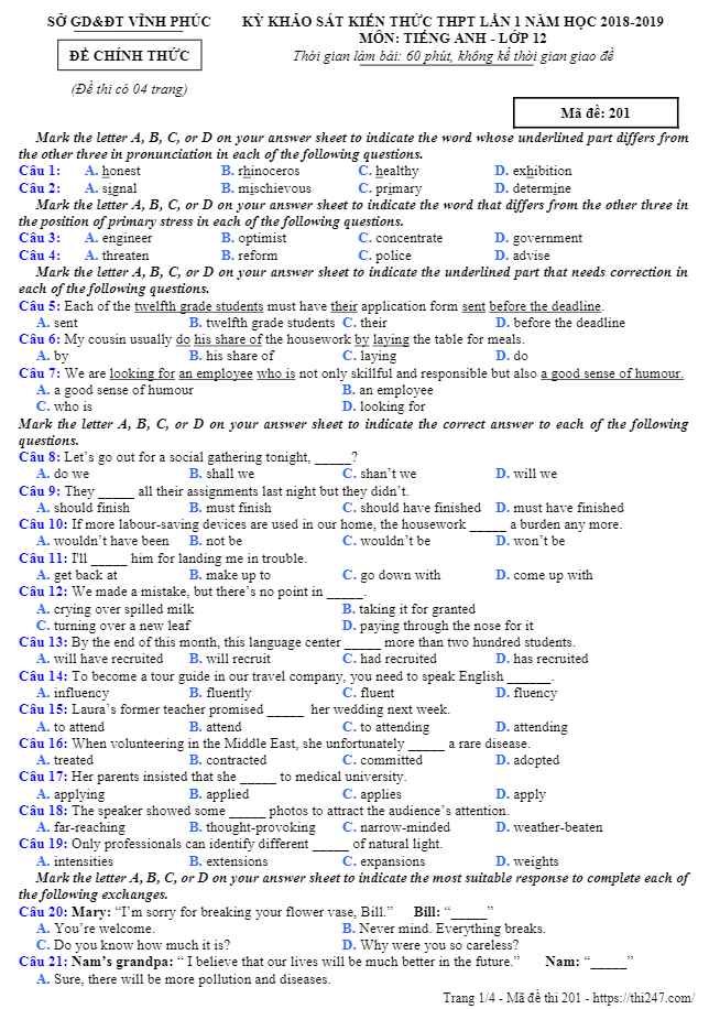 Trích dẫn đề thi thử THPTQG 2019 môn Tiếng Anh lần 3 trường Yên Lạc 2 – Vĩnh Phúc: