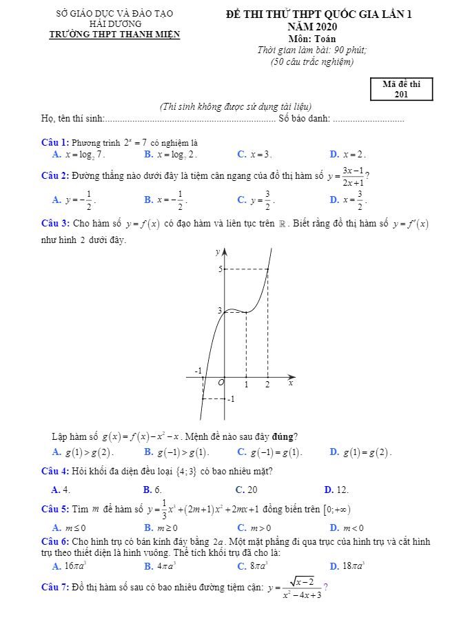 Đề thi thử THPTQG 2021 môn Toán lần 1 trường Đoàn Thượng – Hải Dương