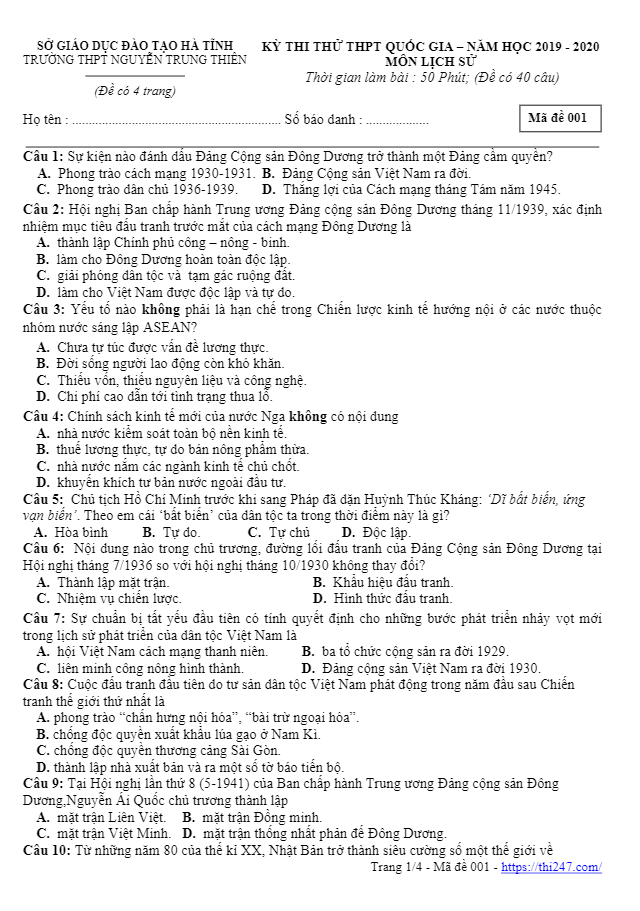 THI247.com giới thiệu đến bạn đọc PDF đề thi + đáp án đề thi thử tốt nghiệp THPT 2021 lần 1 môn Lịch sử trường THPT Nguyễn Trung Thiên, tỉnh Hà Tĩnh.