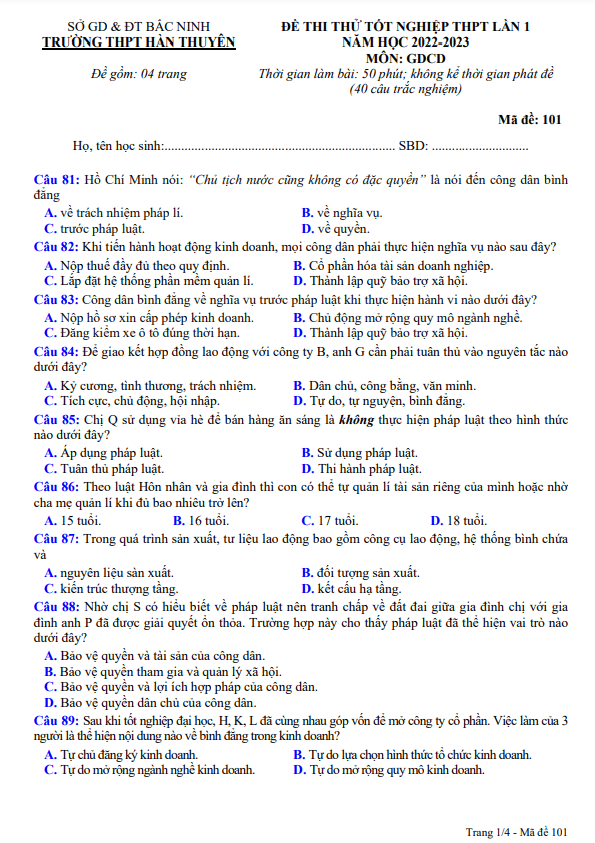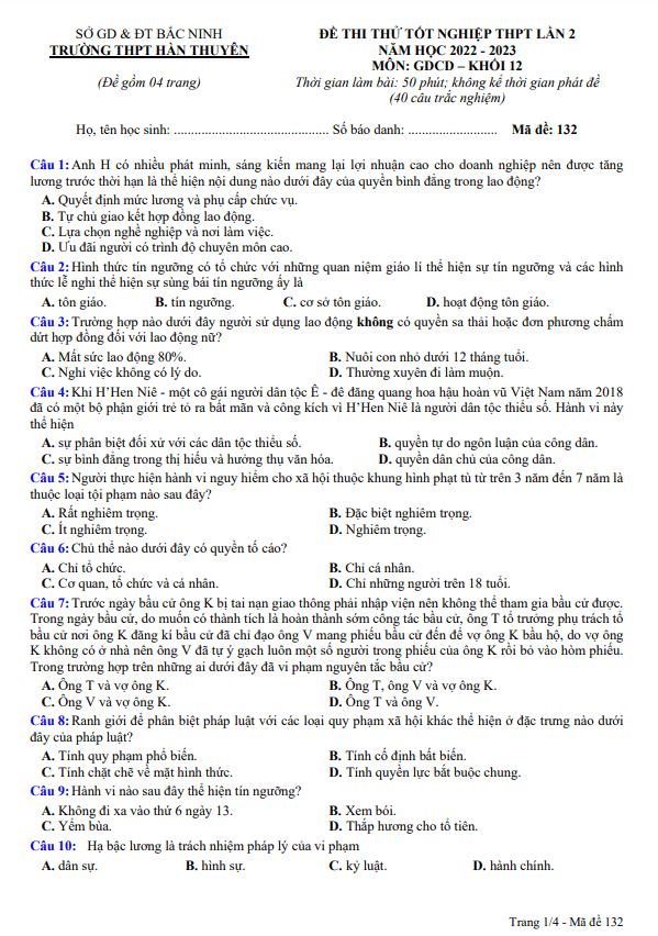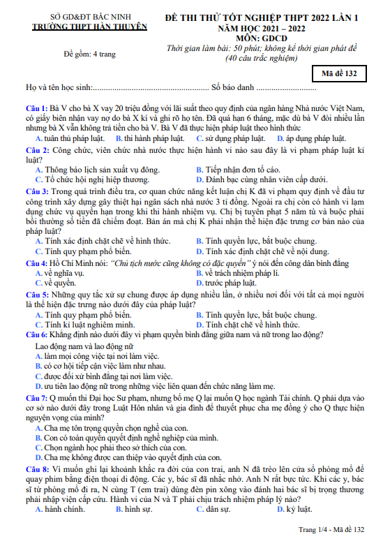 Đề thi thử TN THPT 2021 lần 2 môn GDCD trường THPT Hàn Thuyên – Bắc Ninh