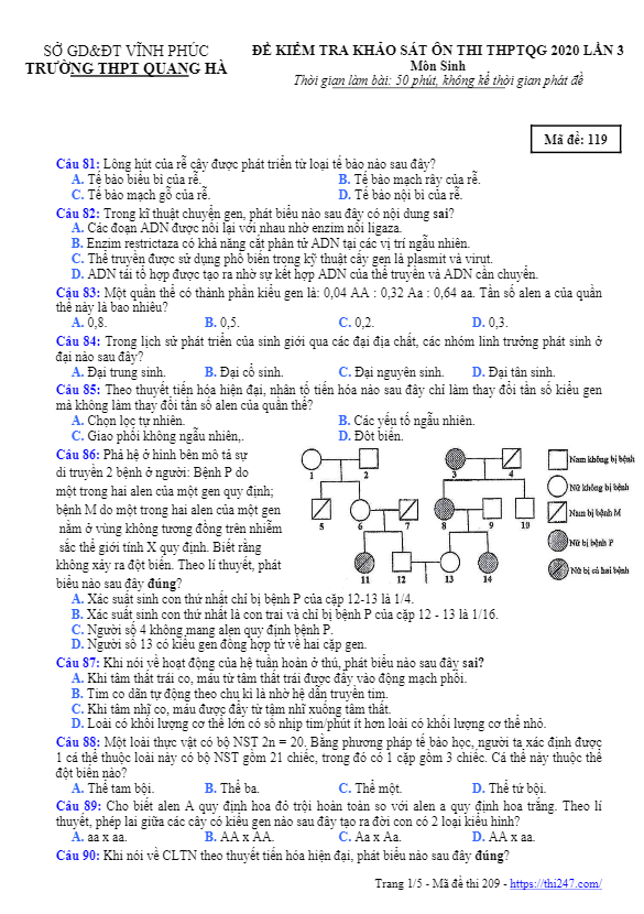 Câu 10: Phép lai P: Aa AA, tạo ra F1. Theo lí thuyết, F1 có tối đa bao nhiêu loại kiểu gen A. 2. B. 4. C. 1. D. 3. Câu 11: .Sinh vật nào sau đây có quá trình trao đổi khí giữa cơ thể với môi trường ngoài diễn ra bằng hệ thống ống khí? A. Voi. B. Châu chấu. C. Cá trắm cỏ. D. Nai. Câu 12: Trong tế bào nucleootit loại uraxin là đơn phân cấu tạo nên phân tử nào sau đây? A. C.Lipit B. tARN C. Protein D. ADN Câu 13: Quá trình nào sau đây có giai đoạn hoạt hóa axit amin? A. Dịch mã. B. Phiên mã tổng hợp mARN. C. Phiên mã tổng hợp tARN. D. Nhân đôi ADN. Câu 14: Nhân tố tiến hóa nào sau đây làm xuất alen mới trong quần thế? A. Đột biến. B. Chọn lọc tự nhiên. C. Các yếu tố ngẫu nhiên. D. Giao phối không ngẫu nhiên. Câu 15: Một quần thể cây thông ở Đà Lạt có khoảng 1000 cây/ha. Đây là ví dụ về đặc trưng nào sau đây của quần thể ? A. Mật độ cá thể. B. Tỉ lệ giới tính. C. Tỉ lệ nhóm tuổi. D. Sự phân bố cá thể