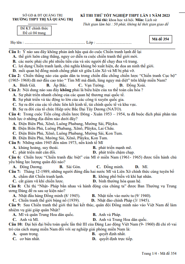 Đề thi thử TN THPT 2023 lần 1 môn Lịch sử trường THPT Vĩnh Linh – Quảng Trị