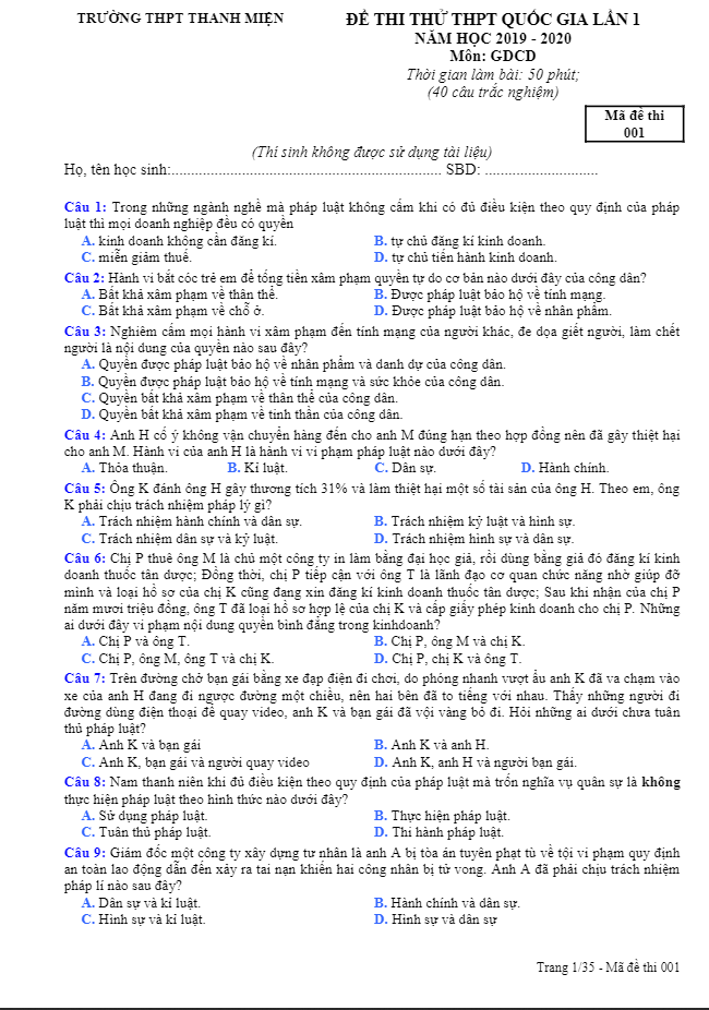Câu 10: Người phải chịu trách nhiệm hình sự về mọi tội phạm do mình gây ra có độ tuổi theo quy định của pháp luật là người đạt độ tuổi A. từ đủ 14 tuổi trở lên. B. từ đủ 16 tuổi trở lên. C. từ đủ 18 tuổi trở lên. D. đủ 18 tuổi trở lên. Câu 11: Cơ quan công chức nhà nước có thẩm quyền ra quyết định xử lý người điều khiển phương tiện vi phạm nồng độ cồn khi tham gia giao thông trong dịp tết nguyên đán Quý Mão là hình thức thực hiện pháp luật nào dưới đây? A. Thi hành pháp luật. B. Áp dụng pháp luật. C. Tuân thủ pháp luật. D. Sử dụng pháp luật.