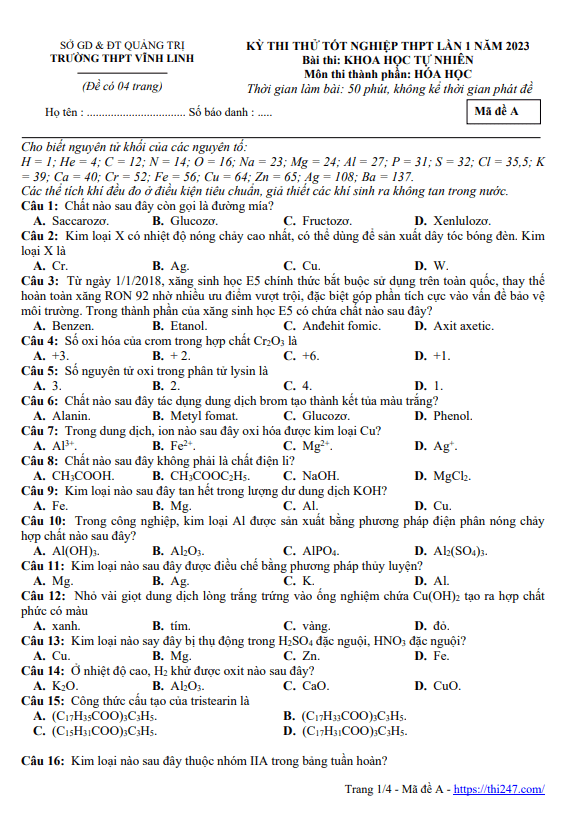 THI247.com sưu tầm và giới thiệu đến bạn đọc nội dung đề thi và bảng đáp án / hướng dẫn giải Đề thi thử TN THPT 2023 môn Hóa học cụm Sóc Sơn & Mê Linh – Hà Nội.