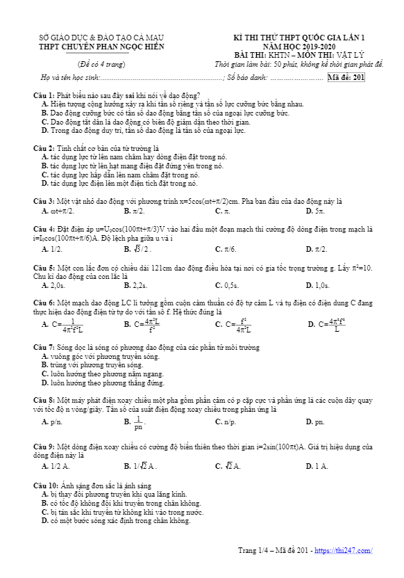 Câu 3: Một vật tham gia đồng thời vào hai dao động điều hòa cùng phương có phương trình li độ Biên độ dao động tổng hợp của vật là Câu 4: Một con lắc đơn có chiều dài, dao động điều hòa tại nơi có gia tốc trọng trường g. Chu kì dao động của con lắc là.