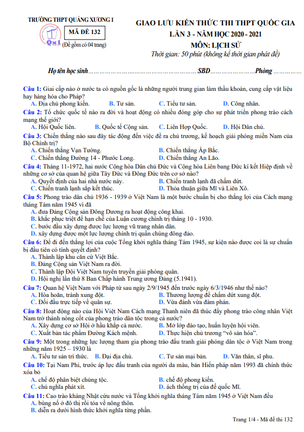 THI247.com giới thiệu đến bạn đọc PDF đề thi + bảng đáp án đề thi thử tốt nghiệp THPT Quốc gia năm học 2020 – 2021 môn Lịch sử lần 1 trường Lý Thái Tổ, tỉnh Bắc Ninh.