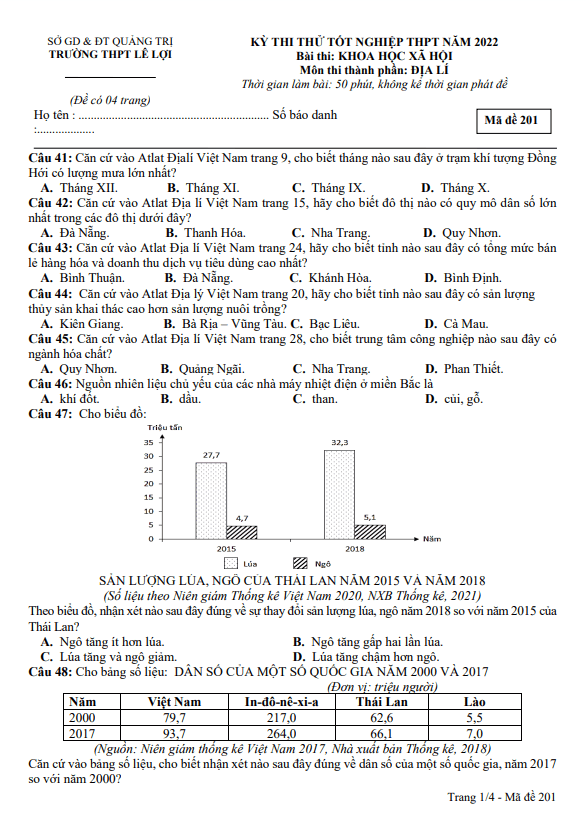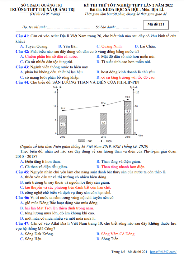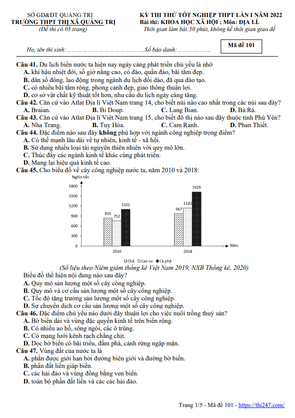 Trích dẫn đề thi thử tốt nghiệp THPT 2020 lần 1 môn Địa lí trường THPT thị xã Quảng Trị: