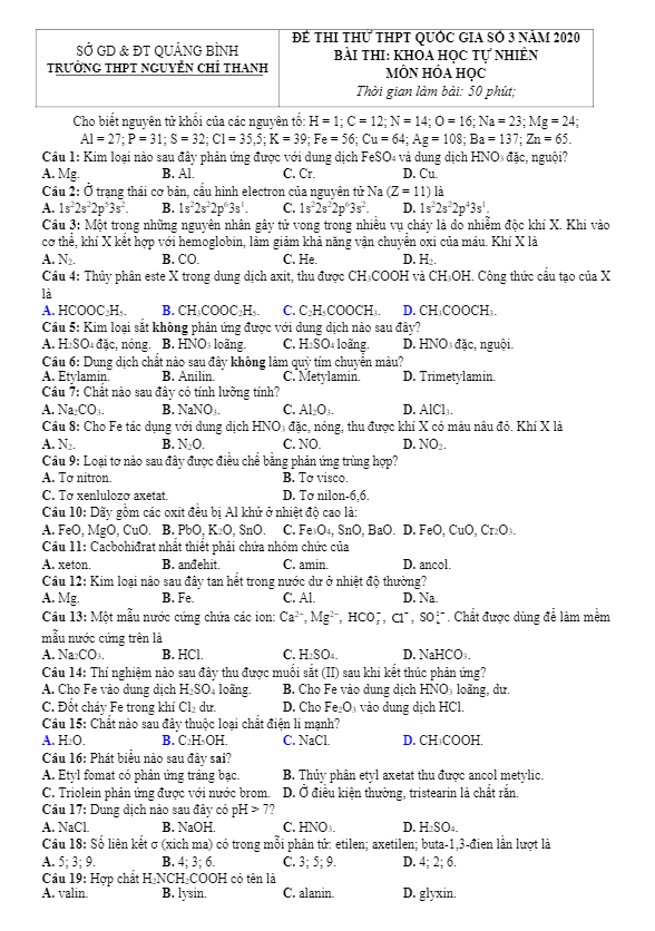 THI247.com sưu tầm và chia sẻ đến bạn đọc nội dung đề thi và bảng đáp án đề thi thử tốt nghiệp THPT 2020 lần 1 môn Hóa học sở GD&ĐT Bình Phước, đề thi bám sát cấu trúc đề minh họa THPT Quốc gia môn Hóa học của Bộ Giáo dục & Đào tạo; đây là một đề thi thử chất lượng mà các bạn không nên bỏ qua trong quá trình ôn thi THPTQG môn Hóa học.