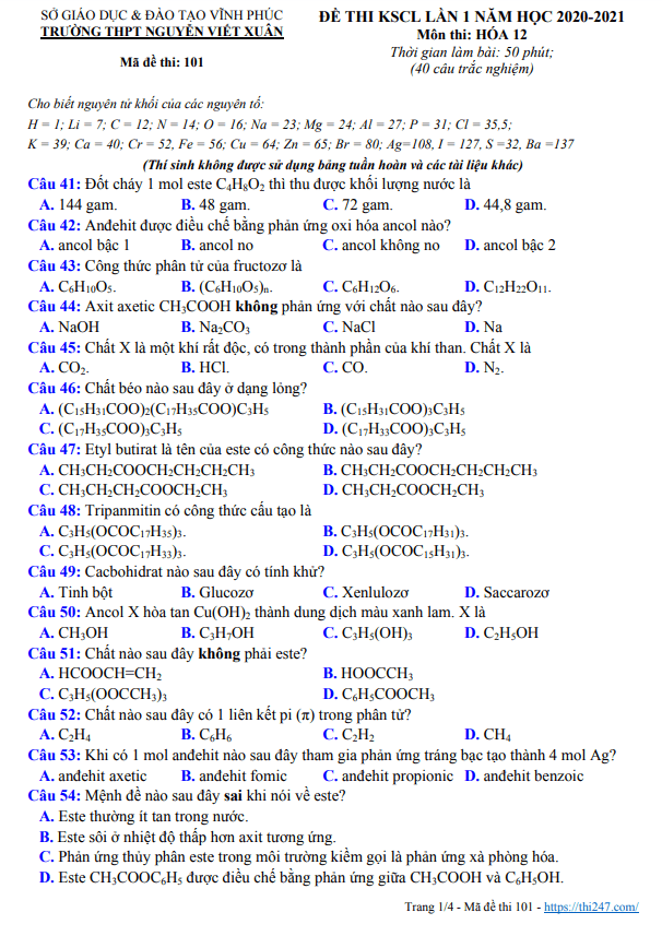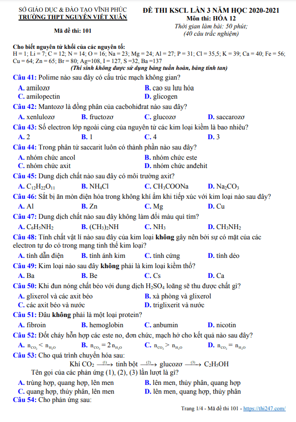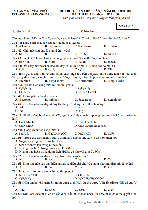 THI247.com giới thiệu đến bạn đọc PDF đề thi + bảng đáp án (tất cả các mã đề) đề khảo sát kiến thức chuẩn bị cho kỳ thi tốt nghiệp THPT 2021 môn Hóa học lần 2 sở GD&ĐT Vĩnh Phúc.
