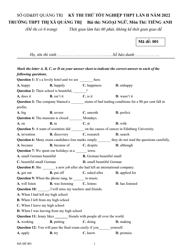 THI247.com giới thiệu đến bạn đọc nội dung đề thi và bảng đáp án / hướng dẫn giải đề thi thử tốt nghiệp THPT 2022 môn Tiếng Anh trường THPT Lê Lợi – Quảng Trị.
