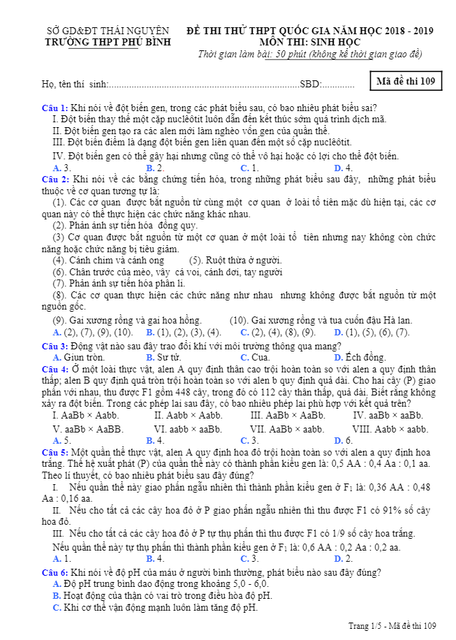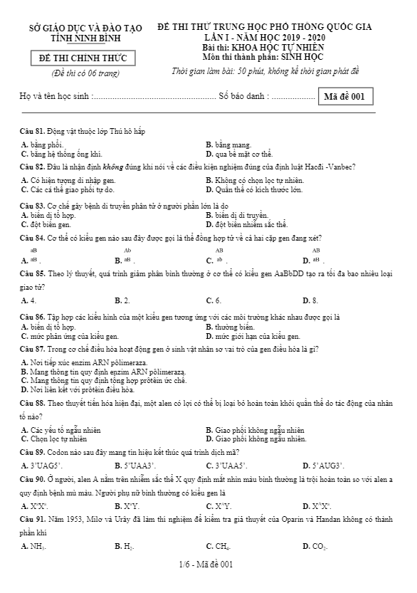 Câu 91: Hệ tuần hoàn của động vật nào sau đây không có mao mạch? A. Cá chép. B. Mèo C. Ếch đồng. D. Tôm sông Câu 92: Loại axit nucleic nào sau đây mang bộ ba đối mã (anticodon)? A. tARN. B. rARN. C. ADN. D. mARN. Câu 93: Cá voi xanh sống ở biển Thái Bình Dương. Môi trường sống của loài này là A. Nước mặn. B. Nước ngọt. C. Mặt đất. D. Nước lợ. Câu 94: Trong cấu trúc opêron Lac ở vi khuẩn E. coli không có A. vùng khởi động (P). B. gen điều hoà. C. các gen cấu trúc Z, Y, A D. vùng vận hành (O). Câu 95: Hô hấp ở thực vật diễn ra thấp nhất ở giai đoạn nào sau đây? A. Cây đang ra hoa. B. Hạt đang nảy mầm. C. Hạt khô. D. Quả đang chín.
