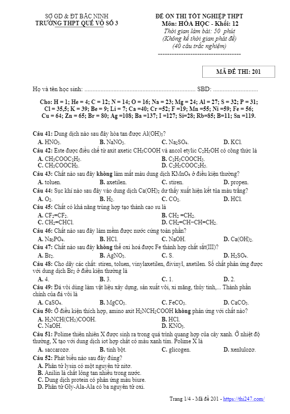 Trích dẫn đề thi thử tốt nghiệp THPT môn Hóa học năm 2020 sở GD&ĐT tỉnh Bắc Ninh: