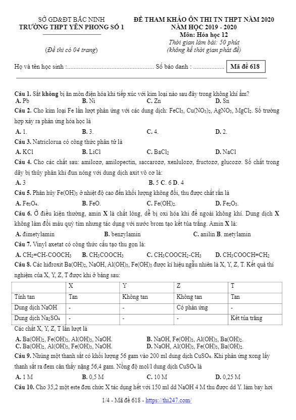 THI247.com sưu tầm và chia sẻ đến bạn đọc nội dung đề thi và bảng đáp án đề thi thử tốt nghiệp THPT năm 2020 môn Hóa học sở GD&ĐT Cà Mau.