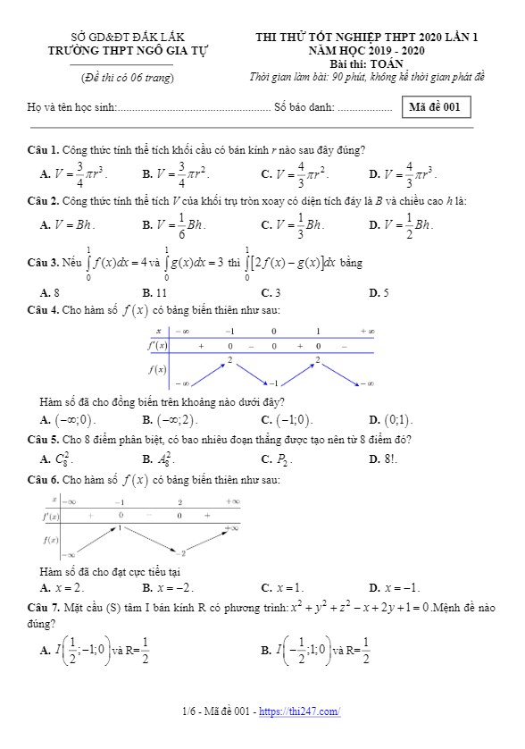 Dựa trên ma trận đề tham khảo tốt nghiệp THPT 2020 môn Toán của Bộ Giáo dục và Đào tạo, sở Giáo dục và Đào tạo tỉnh Cà Mau đã biên soạn và tổ chức thi thử kỳ thi tốt nghiệp THPT 2020 môn Toán.