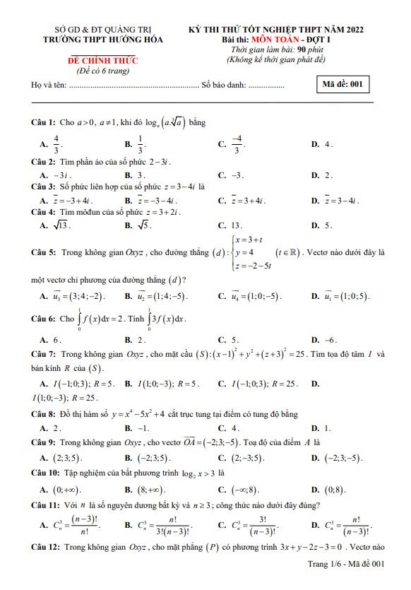 THI247.com giới thiệu đến bạn đọc nội dung đề thi + bảng đáp án (tất cả các mã đề) đề thi thử tốt nghiệp THPT năm 2022 môn Toán trường THPT Hương Sơn – Hà Tĩnh.